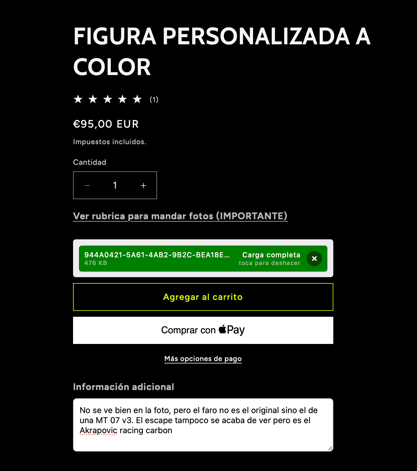 from 1 reviewsLa figura está de lujo. Pedí una cromada de mi mt09 y yo con mi mono de dainese y la verdad es que el nivel de detalle me sorprendió. Se ve casi igual a la foto, es como tener una miniatura exacta. Tardaron un poco más de lo que esperaba, me lo compensaron con un detalle que me moló mucho.La calidad de la figura es una locura, la personalización también está muy bien hecha.